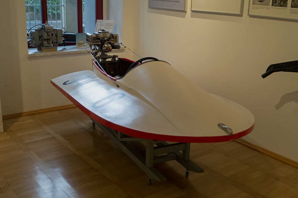 Rennboot mit König-Rennmotor Textil- u, Rennsport-Museum